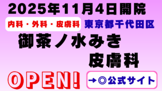 2025年11月4日、東京都千代田区に開院した御茶ノ水みき皮膚科。湿疹・かぶれ・水虫・じんましん・にきび・いぼなど一般皮膚科診療のほか、小児皮膚科・美容皮膚科にも対応。最新レーザー「VビームⅡ」「ピコシュア」を導入し、シミ治療も可能。JR御茶ノ水駅近く、WEB予約対応。女性医師在籍で安心して通える地域密着型の皮膚科クリニックです。
