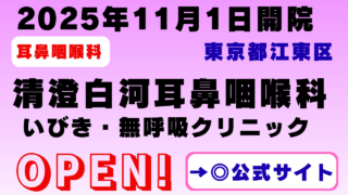 2025年11月1日、東京都江東区清澄白河に開院した清澄白河耳鼻咽喉科 いびき・無呼吸クリニック。花粉症・アレルギー性鼻炎・小児耳鼻咽喉科・補聴器外来など幅広く対応。いびき・睡眠時無呼吸症候群の専門診療も実施。診療時間は18時半まで、土曜は14時まで。休診日は火曜午前・木曜午後・土曜午後・日曜祝日。地域に寄り添う耳鼻科クリニックです。