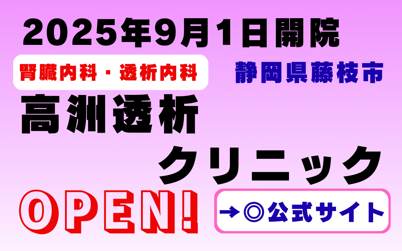 2025年9月1日、静岡県藤枝市に新しく開院した「高洲透析クリニック」は、慢性腎不全の患者さんに向けた質の高い血液透析を提供する地域密着型クリニックです。最新設備を備え、オンラインHDFにも対応。個室完備でプライバシーにも配慮されており、通院が困難な方には送迎サービスも提供しています。