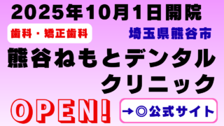 2025年10月1日、埼玉県熊谷市に開院した熊谷ねもとデンタルクリニック。虫歯治療や歯周病治療などの一般歯科のほか、精密根管治療・セラミック治療・ホワイトニングなどの審美歯科にも対応。小児歯科にも力を入れ、家族みんなで通える歯科医院。WEB予約対応・駐車場完備で通いやすく、地域に寄り添う安心のかかりつけ歯科です。