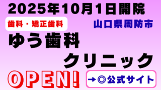 2025年10月1日、山口県防府市に開院したゆう歯科クリニック。日本歯周病学会認定医が在籍し、虫歯治療や歯周病予防、インプラントやホワイトニング、マウスピース矯正など幅広く対応。防府駅から徒歩5分で駐車場も完備。小児歯科も実施し、子どもから大人まで安心して通える地域密着の歯科クリニックです。