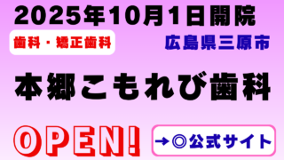 2025年10月1日、広島県三原市に開院した本郷こもれび歯科。マックスバリュ本郷店そばにあり、0歳から通える予防歯科に注力。キッズルームやベビーカーで入れる完全個室を完備し、虫歯・歯周病治療のほか、インプラントやホワイトニングにも対応。土曜・月1回日曜診療、駐車場あり、WEB予約可能。家族で安心して通える歯科クリニックです。