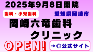 2025年9月8日、愛知県岡崎市に開院した岡崎六竜歯科クリニック。一般歯科・小児歯科・予防歯科・審美治療・インプラント・口腔外科まで幅広く対応。平日18時まで診療、休診日:木曜・日曜・祝日。駐車場6台完備、「戸崎口」停留所から徒歩4分。地域密着で安心できる歯科クリニックです。