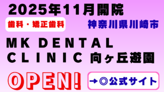 2025年11月、神奈川県川崎市多摩区に開院したMK DENTAL CLINIC 向ヶ丘遊園。虫歯治療や予防歯科に加え、インプラント治療、矯正歯科、審美歯科など幅広く対応する歯科医院です。向ヶ丘遊園駅徒歩2分、登戸駅徒歩6分でアクセス良好。キッズスペース完備、ベビーカー・車いすでも通いやすい院内。予約制でWEB予約対応。地域に寄り添う安心して通えるかかりつけ歯科です。