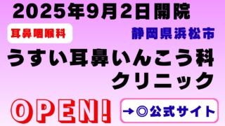 耳鼻咽喉科、アレルギー科 【うすい耳鼻いんこう科クリニック】OPEN!静岡県浜松市中央区|クチコミ・予約情報・アクセス等まとめ 2025年9月2日、静岡県浜松市中央区に開院したうすい耳鼻いんこう科クリニック。耳・鼻・のどのお悩みに対応し、舌下免疫療法や睡眠時無呼吸症候群治療、補聴器相談も可能。診療は18時まで、休診日:木曜午後・土曜午後・日祝。駐車場完備でWEB予約対応、地域に根差した安心のクリニックです。 2025.09.29 耳鼻咽喉科、アレルギー科